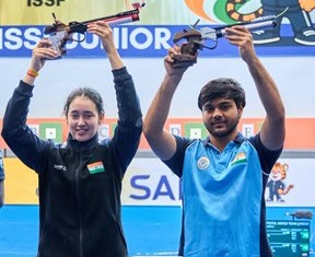 नवी दिल्ली ः आयएसएसएफ ज्युनियर वर्ल्ड कप स्पर्धेत भारतीय नेमबाजांनी १० मीटर एअर पिस्तूल मिश्र सांघिक स्पर्धेत वर्चस्व गाजवले आणि अव्वल दोन स्थाने मिळवली. कझाकस्तानमध्ये झालेल्या आशियाई अजिंक्यपद स्पर्धेत महिला आणि पुरुषांच्या १० मीटर एअर पिस्तूल ज्युनियर स्पर्धेत वैयक्तिक सुवर्णपदके जिंकणाऱ्या रश्मिका आणि कपिलने स्पर्धेच्या तिसऱ्या दिवशी एअर पिस्तूल मिश्र सांघिक सुवर्णपदक जिंकले.