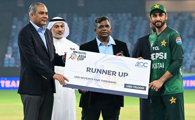 सामन्यानंतरच्या सादरीकरण समारंभात, कर्णधार सलमान आघा याने आशियाई क्रिकेट परिषदेचे प्रतिनिधी अमिनुल इस्लाम यांच्याकडून उपविजेत्याचा चेक घेतला आणि त्यानंतर मागे वळून तो जमिनीवर फेकला. त्यानंतर प्रेक्षकांकडून मोठ्याने ओरड सुरू झाली.