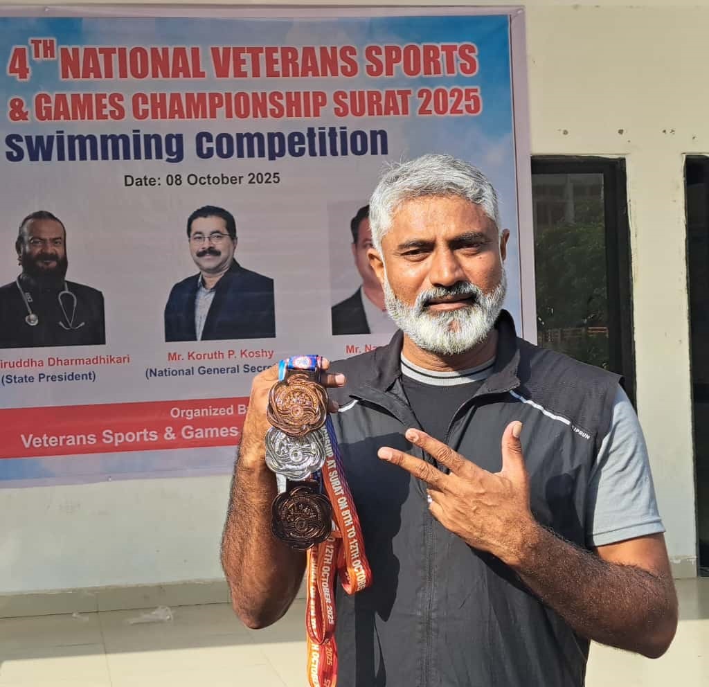 सुरत (गुजरात) : वीर नर्मदा दक्षिण गुजरात विद्यापीठाच्या जलतरण तलावावर नुकतीच चौथी राष्ट्रीय मास्टर्स जलतरण स्पर्धा मोठ्या उत्साहात पार पडली. या स्पर्धेत महाराष्ट्रातील वरिष्ठ जलतरणपटूंनी प्रभावी कामगिरी केली असून, छत्रपती संभाजीनगरचे जलतरणपटू व प्रशिक्षक राजेश भोसले यांनी आपल्या दमदार कामगिरीच्या जोरावर एकूण तीन पदकांची (१ रौप्य, २ कास्य) कमाई करत महाराष्ट्राचा झेंडा उंचावला.