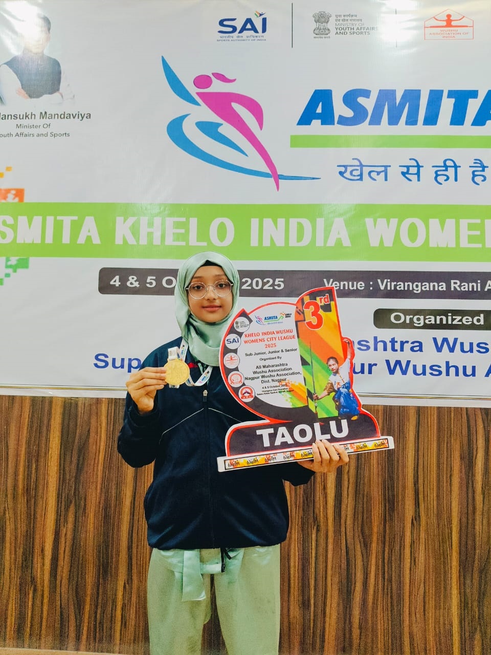 राणी अवतांबाई तालुका क्रीडा संकुल कोराडी, नागपूर येथे झालेल्या अस्मिता खेलो इंडिया वुमन्स वुशु लीग स्पर्धेमध्ये शेख जुनेरा फातेमा हिने आपली शानदार कामगिरी दाखवत सुवर्णपदक पटकावले आणि छत्रपती संभाजीनगर विभागाला तिसरा क्रमांक प्राप्त करून दिला.