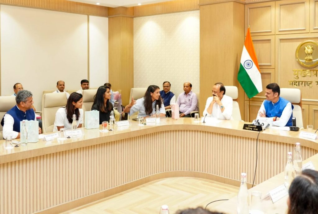 मुंबई: मुख्यमंत्री देवेंद्र फडणवीस यांच्या हस्ते आयसीसी महिला क्रिकेट विश्वचषक विजेत्या भारतीय संघातील महाराष्ट्राच्या खेळाडू उपकर्णधार स्मृती मानधना, जेमिमा रॉड्रिग्स आणि राधा यादव, तसेच मुख्य प्रशिक्षक अमोल मुझुमदार यांचा सत्कार करण्यात आला. या कार्यक्रमात उपमुख्यमंत्री अजित पवार, मंत्री आशिष शेलार, क्रीडा मंत्री माणिकराव कोकाटे आणि इतर मान्यवर उपस्थित होते.