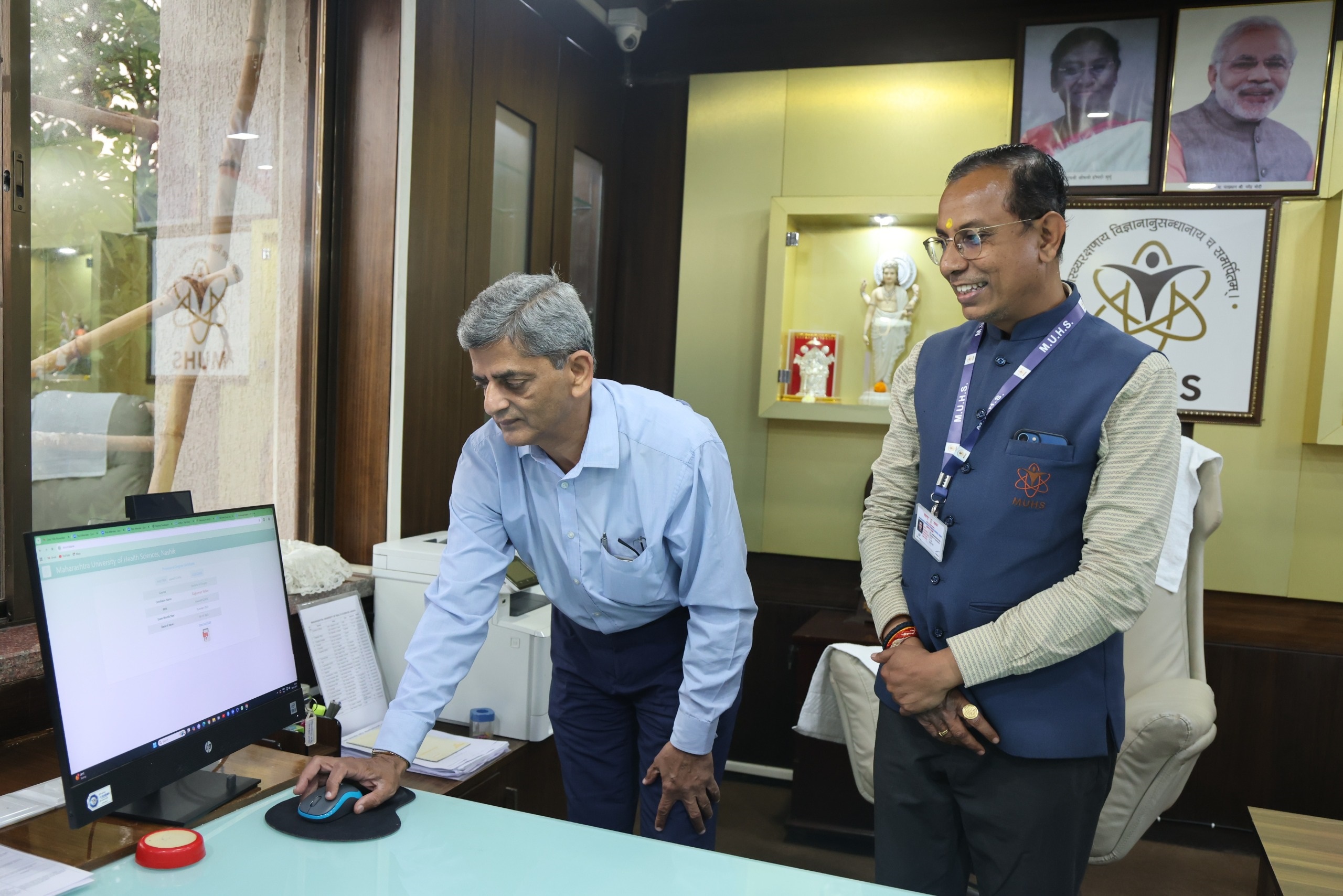 नाशिक ःमहाराष्ट्र आरोग्य विज्ञान विद्यापीठाच्या पदव्युत्तर अभ्यासक्रमांच्या विद्यार्थ्यांना तात्पुरते पदवी प्रमाणपत्र देण्यासाठी ऑनलाईन स्टुडन्ट पोर्टलचे उद्घाटन विद्यापीठाचे प्रभारी कुलगुरू डॉ अजय चंदनवाले यांच्या हस्ते करण्यात आले. यावेळी परीक्षा नियंत्रक डॉ संदीप कडू उपस्थित होते.